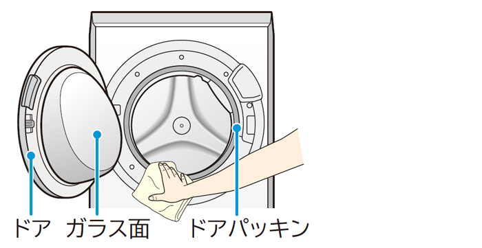 ●ドアパッキンやパッキン裏側に糸くずがたまると、水漏れや洗濯物への糸くず付着の原因になります。柔らかい布でふき取ってください。