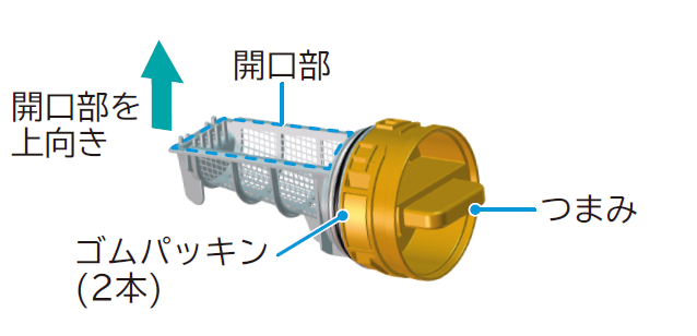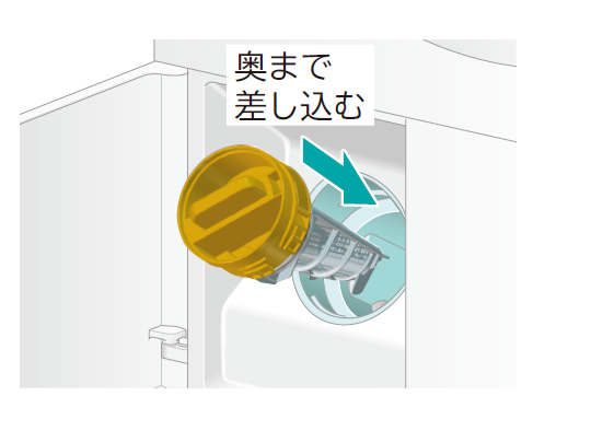 糸くずフィルターの開口部を上に向けた状態で 奥までしっかり差し込む