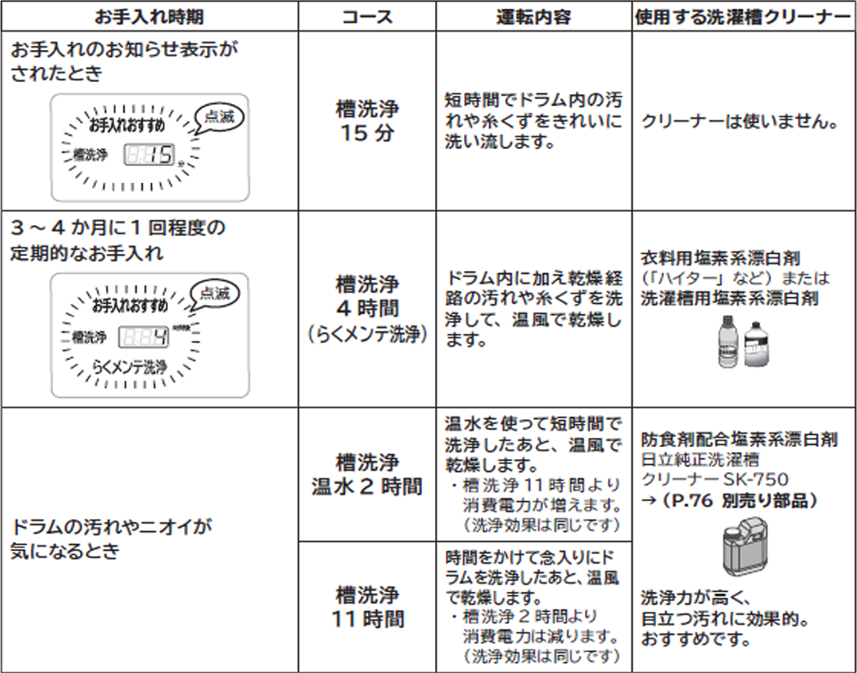 [お手入れおすすめ]表示は、運転回数や、ホコリ・糸くず・汚れ具合を洗濯機が読み取って表示します。槽洗浄15分コースを運転しても、繰り返し[お手入れおすすめ][槽洗浄]などの表示が点滅する場合は、槽洗浄4時間(らくメンテ洗浄)コースを運転してください。