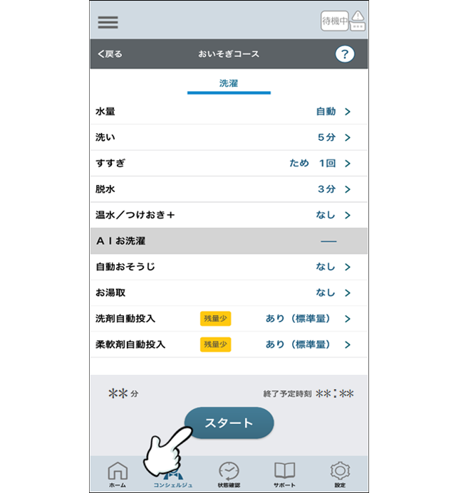 運転を開始するためには、洗濯機を遠隔操作待機状態(リモート状態)にする必要があります。→遠隔操作待機状態(リモート状態)にする