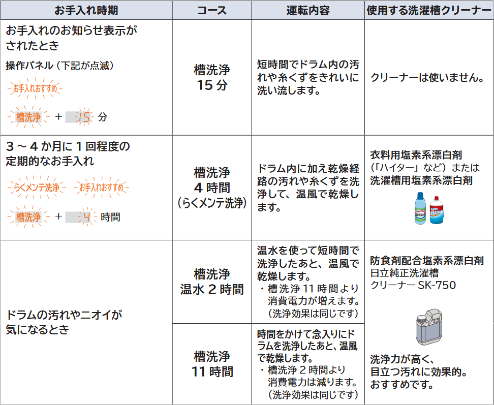 [お手入れおすすめ]表示は、運転回数や、ホコリ・糸くず・汚れ具合を洗濯機が読み取って表示します。槽洗浄15分コースを運転しても、繰り返し[お手入れおすすめ][槽洗浄]などの表示が点滅する場合は、槽洗浄4時間(らくメンテ洗浄)コースを運転してください。