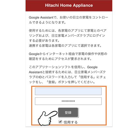10. 日立家電メンバーズクラブIDとパスワードを入力し、「信用する」にチェックを入れ、「登録」をタップする