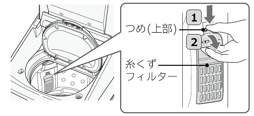 つめ(上部)、(下部)が取り付けられていない状態で運転すると、糸くずフィルターが外れ破損するおそれがあります。