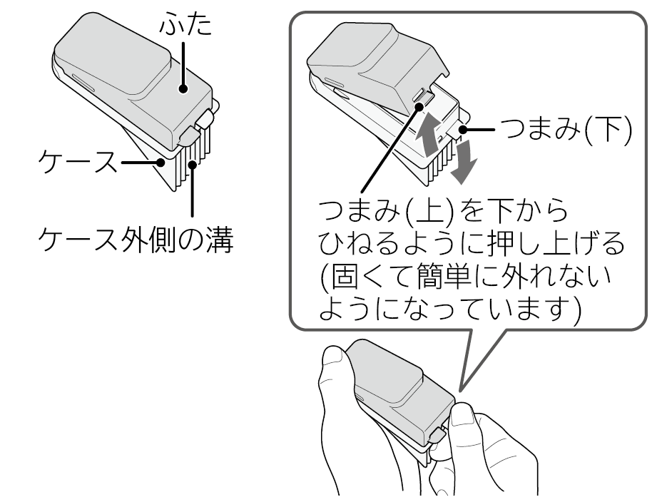 ケースのつまみ(下)を押さえ、ふたのつまみ(上)をひねるようにして取り外し、ケース内に付着している水滴などを、湿った布でふき取ってください。