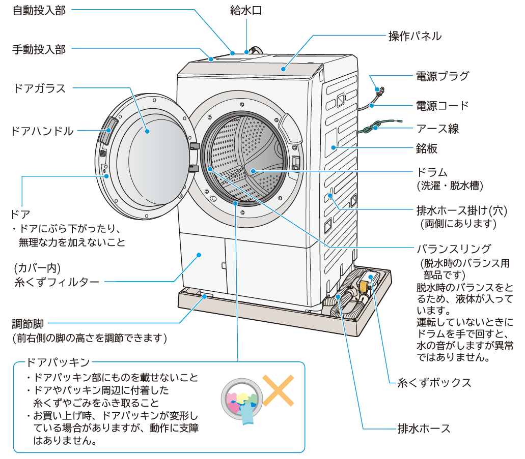 使用する前に、洗濯機各部のなまえと付属品を確認してください。