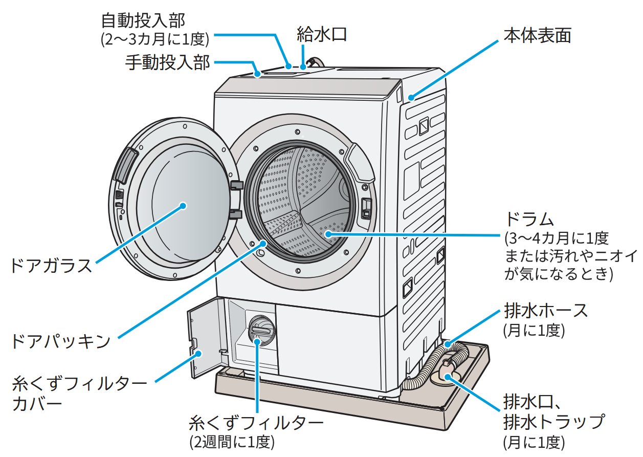 洗濯乾燥機の性能を十分に発揮し、快適にご使用いただくため、定期的にお手入れしてください。