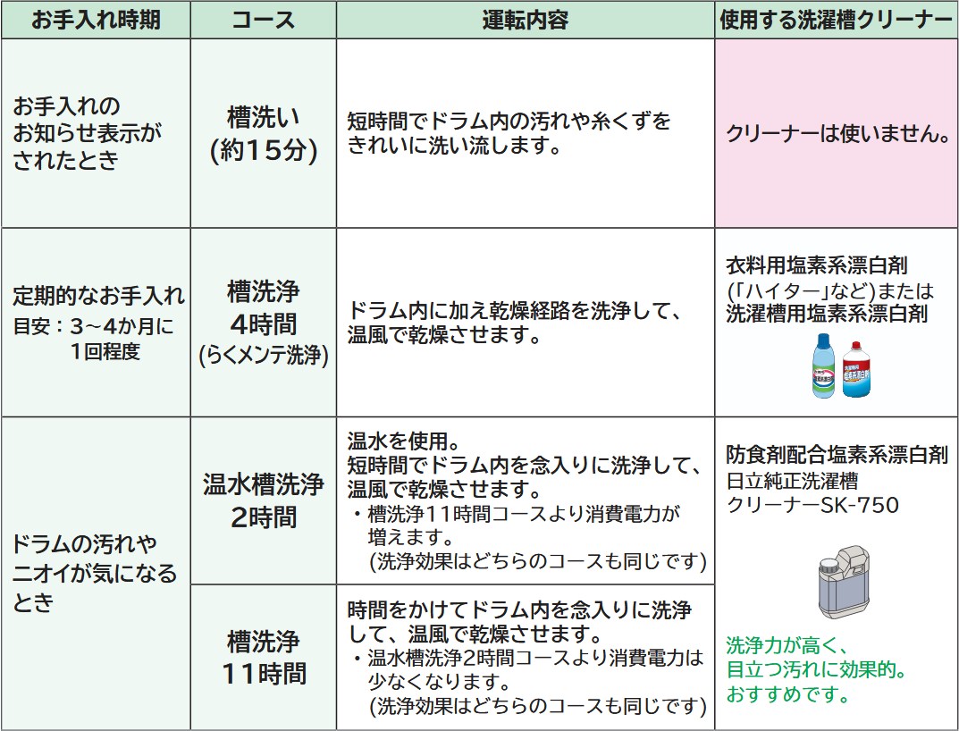 ●ドラムの汚れやニオイが気になるときは「温水槽洗浄2時間」コースや「槽洗浄11時間」コース、