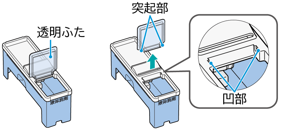 透明ふたを開け、真上に引き、凹部から突起部を取り外す