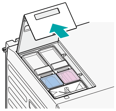 お手入れをした液体洗剤タンクの透明ふたを開けて、タンク内にお湯(約40℃)を入れる