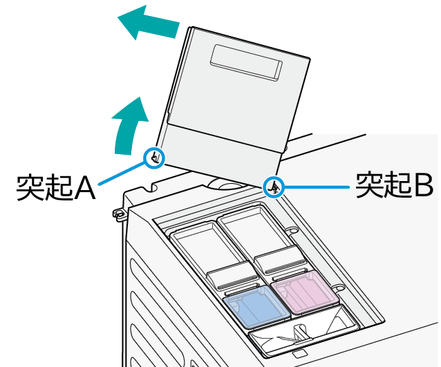 ふたの突起B側を取り付けてから突起A側を取り付ける。