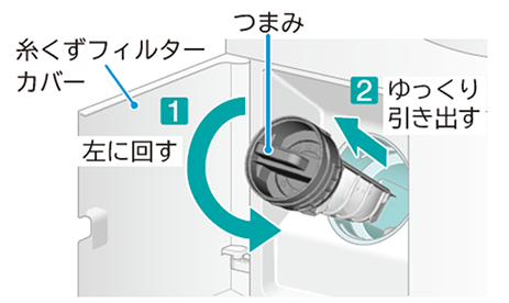 糸くずフィルターのつまみを左の方向に回し、回転が止まったら手前に引き出す