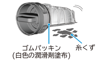 ドアパッキンやパッキン裏側に糸くずがたまると、水漏れや洗濯物への糸くず付着の原因になります。柔らかい布でふき取ってください。