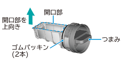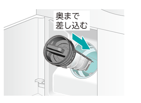 糸くずフィルターの開口部を上に向けた状態で奥までしっかり差し込む