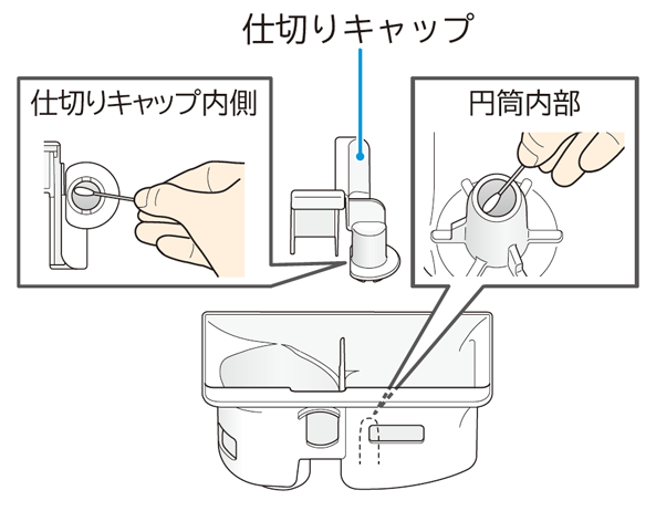 円筒の内側に洗剤が付着しているときは綿棒などで掃除する