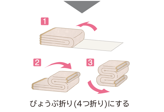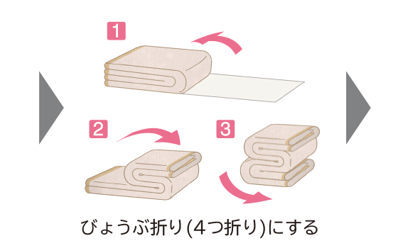 ●掛けふとん :時々裏返すと乾きやすくなります。また、詰め物をほぐすとふっくら仕上がります。