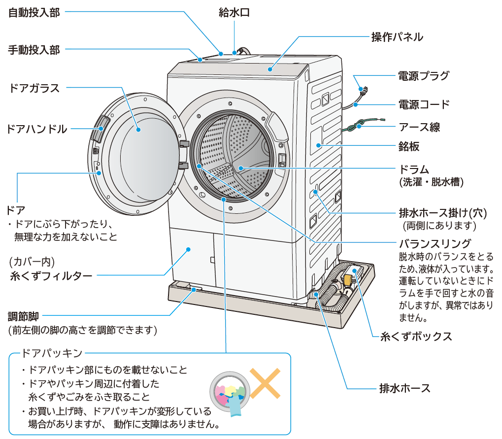 使用する前に、洗濯機各部の名称と付属品を確認してください。※説明書で使用しているイラスト・写真・画像は説明用のため、実際とは多少異なります。