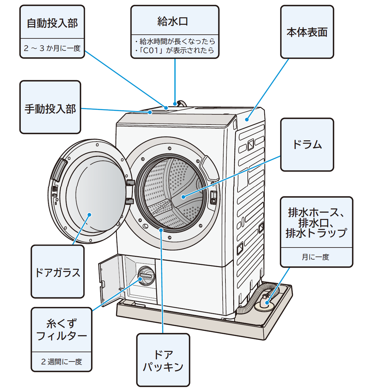 洗濯乾燥機の性能を十分に発揮し、快適にご使用いいただくため、定期的にお手入れしてください。