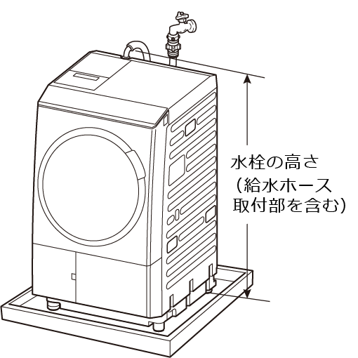 水栓の高さは洗濯機の据付面(床面、防水パン、据付脚、置台など)から本体の給水ホース取付部高さ寸法以上が必要です(各商品の高さについては、外形寸法をご覧ください)。