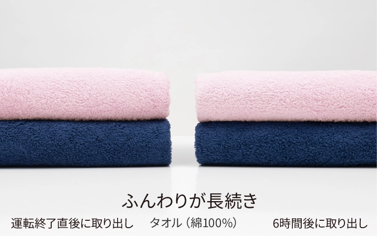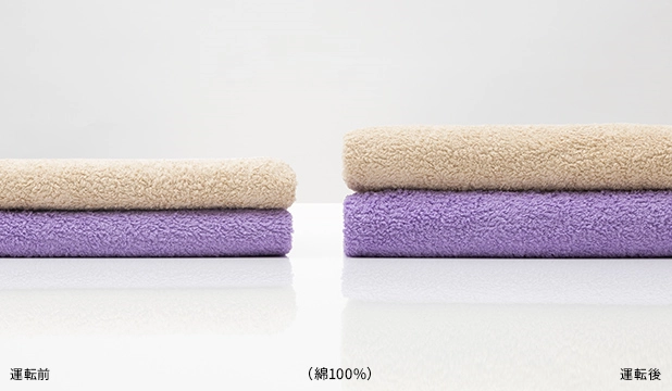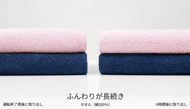※当社調べ。洗濯6kg運転後につり干ししたタオル、BD-CX100P、スチームアイロンコース15分において。 ※衣類の量や素材、一緒に乾燥するものの種類によって仕上がりが異なります。