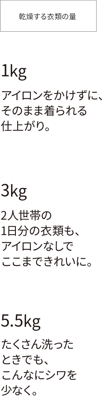 ※衣類の量や素材、一緒に乾燥するものの種類によって仕上がりが異なります。