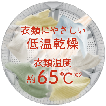 ※2 当社調べ。洗濯〜乾燥コースにおいて。一般社団法人 日本電機工業会で定めた試験布に温度センサーを取り付けて計測。乾燥時の温度は衣類の素材により異なります。また、乾き具合によっては、衣類の温度が高くなる場合があります。