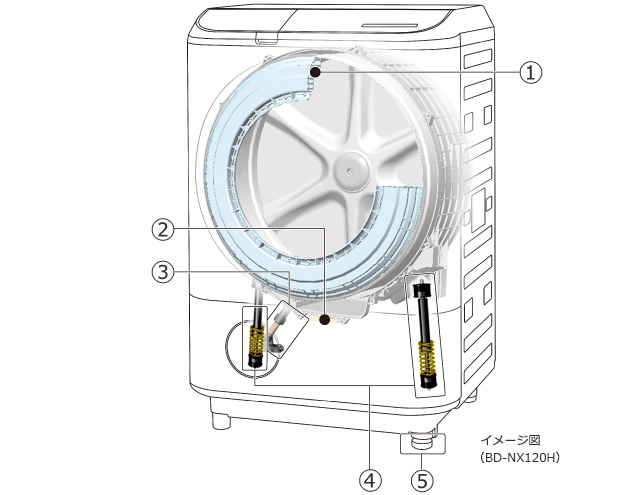 洗濯槽上下の振動と床に伝わる衝撃を抑える。