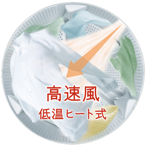 大容積のビッグドラムの中で衣類を大きく舞い上げながら乾燥。高速風を吹きかけて、シワを伸ばします。衣類を蒸らした状態で風を当てることで袖まできれいに。また、衣類温度約65℃※1の低温乾燥で、ふんわりやさしく仕上げます。