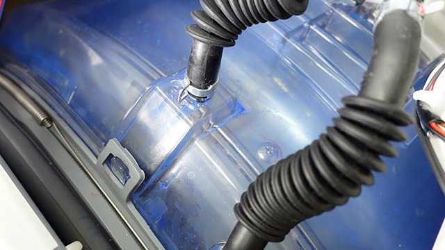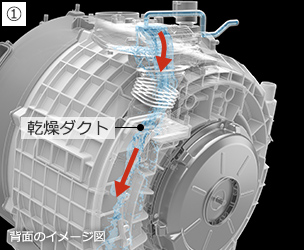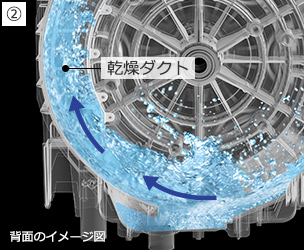 ドラムが回る遠心力で、乾燥ダクトの下から水をかき上げ洗い流す