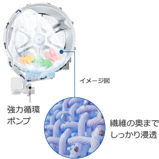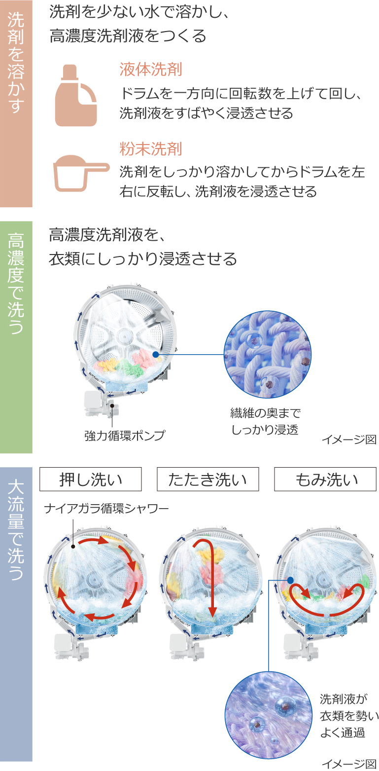 洗剤の種類が液体洗剤か粉末洗剤かを自動で検知し、洗剤に合わせた溶かし方・洗い方をします。さらに、大流量の[ナイアガラ循環シャワー]と、「押し洗い」「たたき洗い」「もみ洗い」で、節水しながらきわだつ白さに洗い上げます。