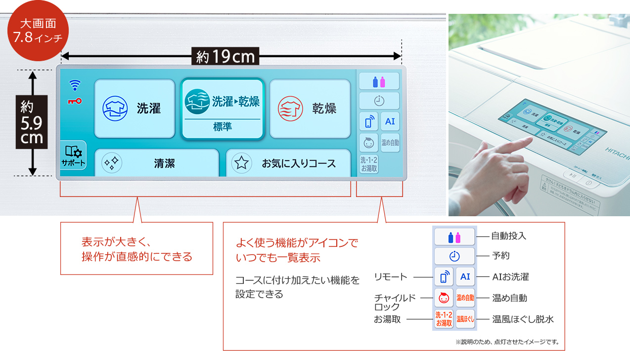 衣類の量や種類、片寄り、室温、据付状態等により、使用水量・消費電力量・運転時間が増減します。