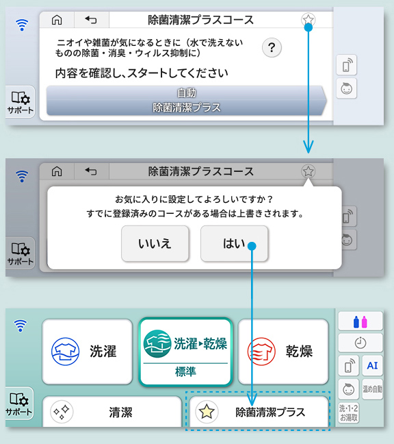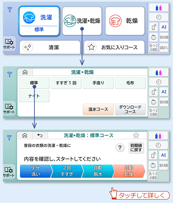 アプリから洗剤や柔軟剤の銘柄を設定していれば、タッチパネルでも今使っている銘柄が確認できる。
