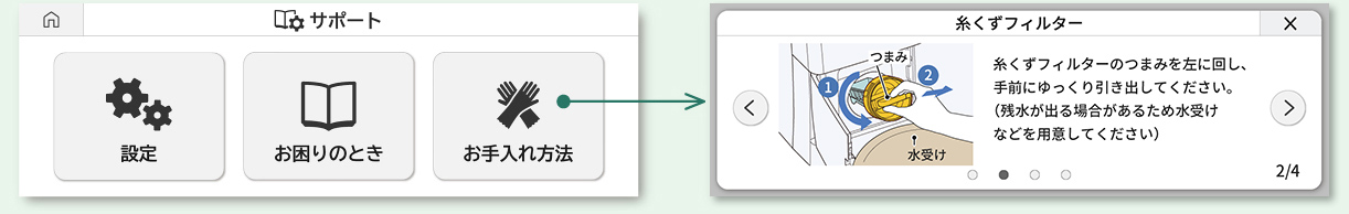 お困りのときのサポート情報やお手入れ方法など、取扱説明書が手元になくても、イラスト入りの説明画面で分かりやすい。