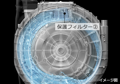 ドラムが回る遠心力で、下から保護フィルターを洗い流す。