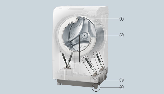 上下・左右・前後の複雑な振動を検知し、ドラム回転数を調整して振動を抑える。