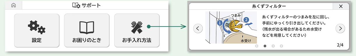 お困りのときのサポート情報やお手入れ方法など、取扱説明書が手元になくても、イラスト入りの説明画面で分かりやすい。