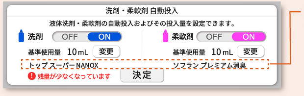 アプリから洗剤や柔軟剤の銘柄を設定していれば、タッチパネルでも今使っている銘柄が確認できる。