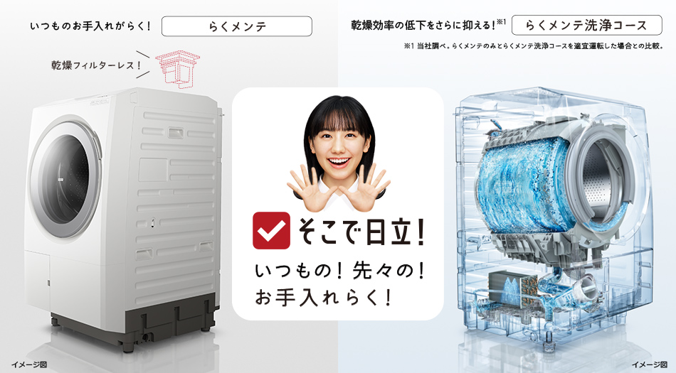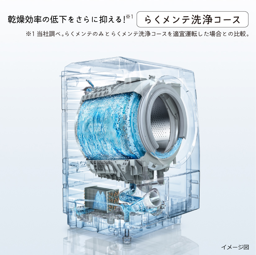 洗濯から乾燥までのホコリ・糸くずを、3つの自動おそうじ機能で[大容量糸くずフィルター]へ集約するから、いつものお手入れがらく。さらに「らくメンテ洗浄」コースで、洗濯槽・乾燥経路・ドアパッキンを強力洗浄。