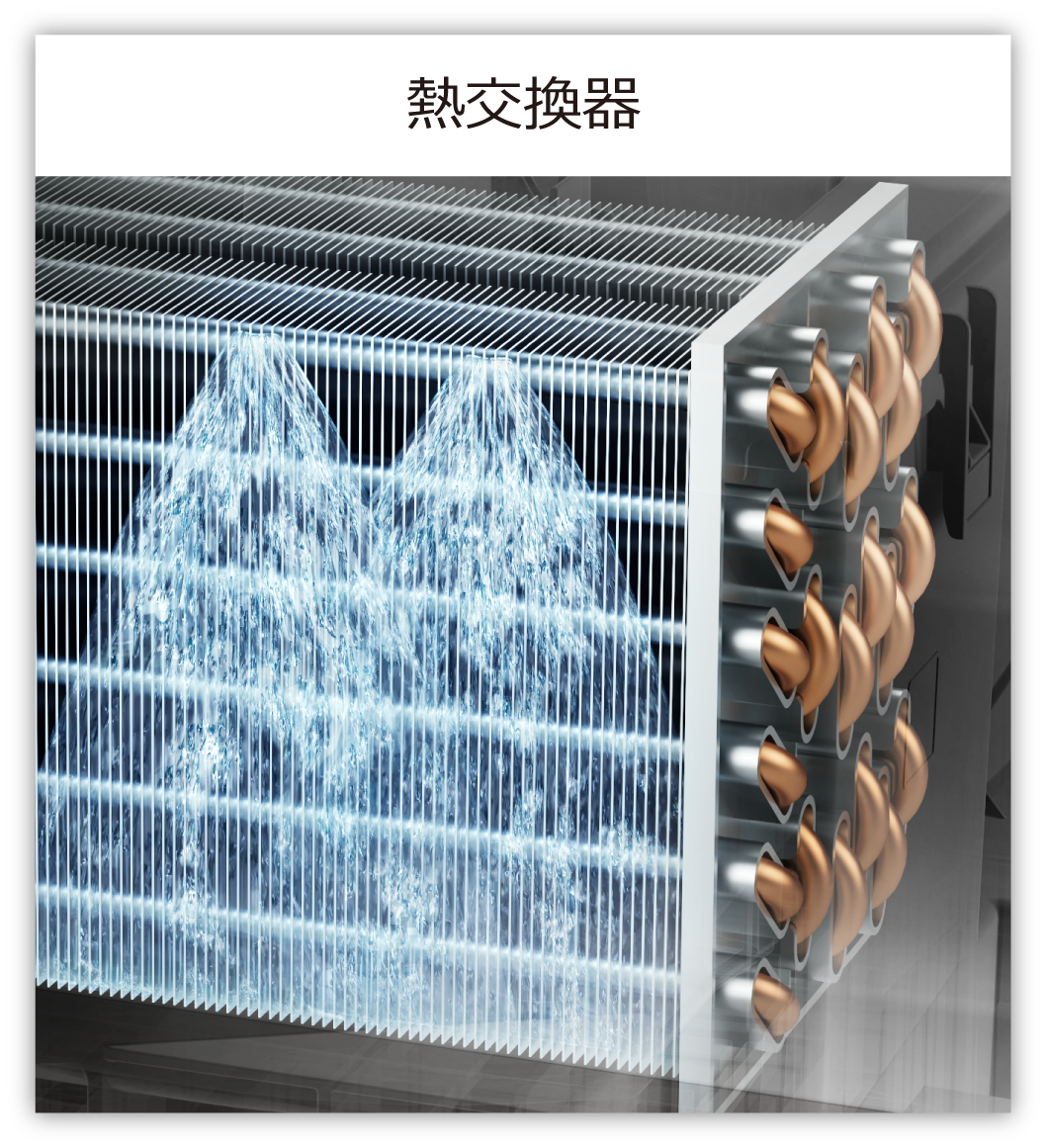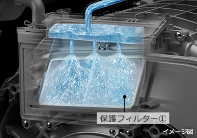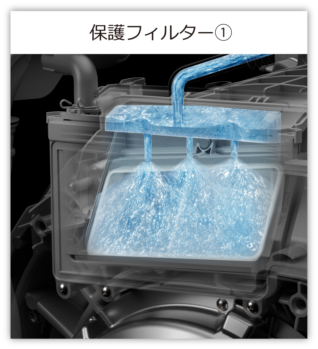 乾燥経路が汚れていると、乾燥時間が長くなるなどの原因に。次の洗濯運転時に、保護フィルターや熱交換器のホコリを自動で洗い流すことで、乾燥効率の低下を抑えます。