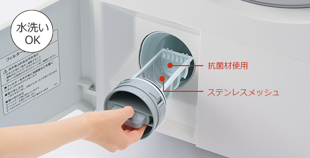 洗濯から乾燥までのホコリや糸くずを[大容量のフィルター]でしっかりキャッチ。1か所に約2週間分まとめられるから、お手入れの頻度を軽減します。清潔さにも配慮して、抗菌材※1を使用しています。