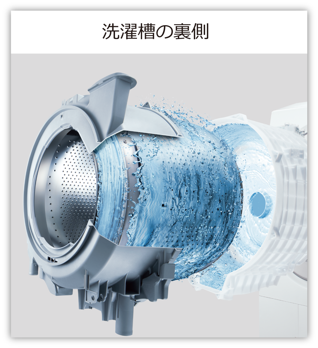 洗濯槽の裏側などの見えない部分に付着しやすい汚れ(皮脂汚れ、洗剤カス、菌、黒カビの胞子など)を自動で洗い流し、除菌、黒カビを抑えます。