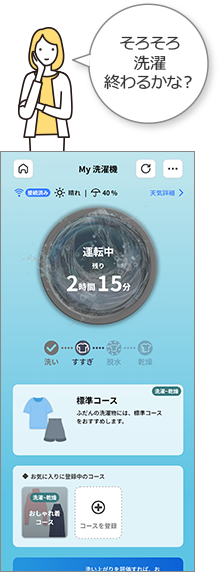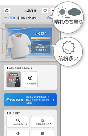 その日の洗濯指数をもとに洗濯物が乾きやすい時間帯をアドバイス、乾きにくいときは部屋干しや乾燥までの運転をおすすめ。また、天気予報や花粉情報も確認できます。
