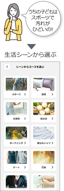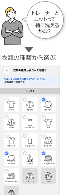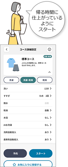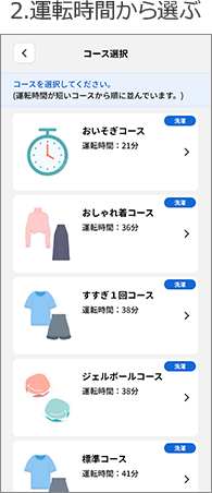 ⽣活シーンや洗濯する⾐類の種類を選ぶと、おすすめの運転コースを提案します。そのままスマホから運転をスタートできます。