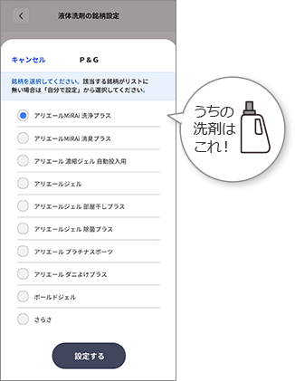 洗剤や柔軟剤の銘柄を指定すれば、投入量やすすぎ回数も自動で設定できます。