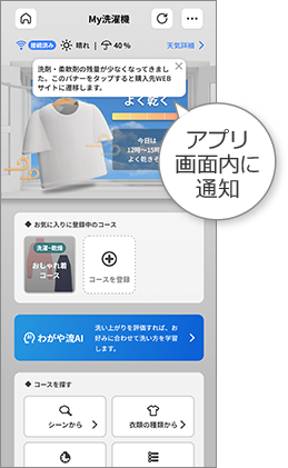自動投入タンク内の残量と家にある在庫量から計測、洗剤や柔軟剤の在庫量が少なくなるたびに、洗剤や柔軟剤を購入できるwebサイトをアプリのホーム画面に通知します。