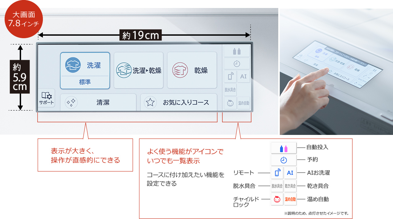 衣類の量や種類、片寄り、室温、据付状態等により、使用水量・消費電力量・運転時間が増減します。