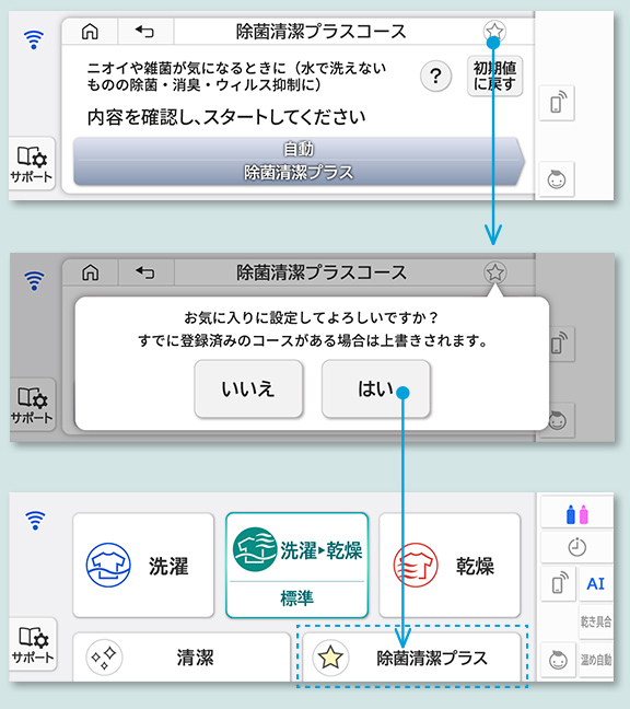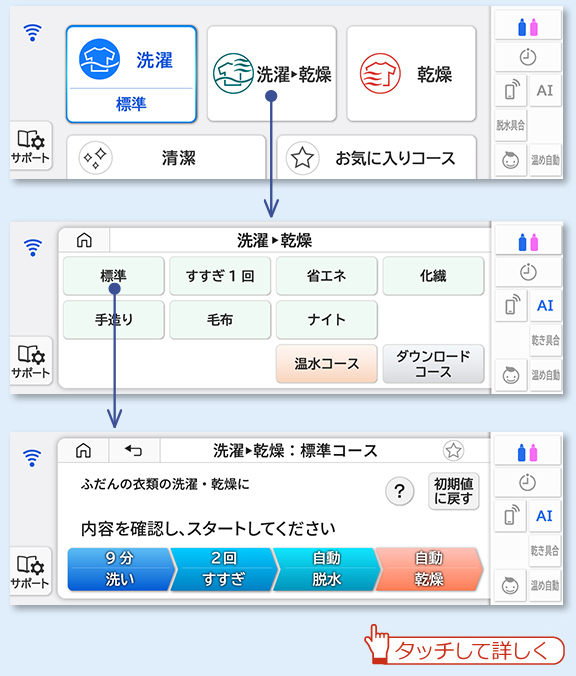 アプリから洗剤や柔軟剤の銘柄を設定していれば、タッチパネルでも今使っている銘柄が確認できる。