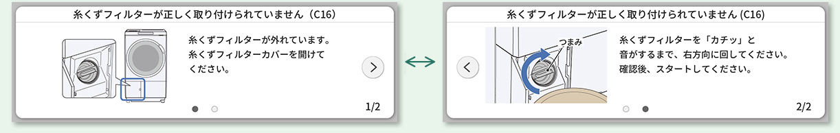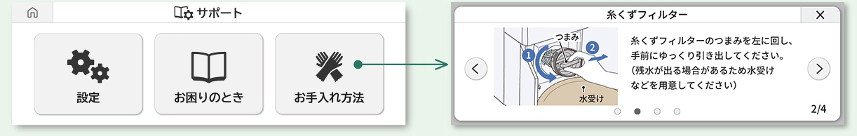 お困りのときのサポート情報やお手入れ方法など、取扱説明書が手元になくても、イラスト入りの説明画面で分かりやすい。