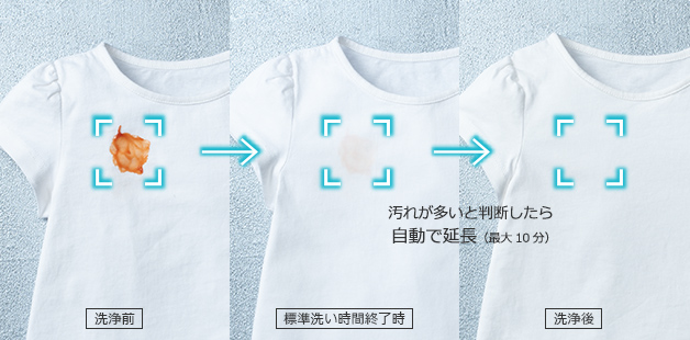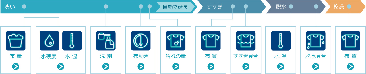 複数のセンサーで洗濯のさまざまな状況をセンシング。洗剤の種類や布質、汚れの量、水の硬度、布動きなどの状況に合わせて洗い方や運転時間などを自動で制御。これにより、かしこくきれいに洗います。