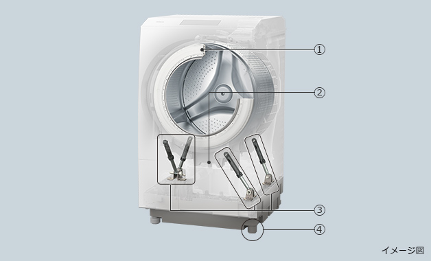 大容量化のため、ダンパーを追加して4本に。上下・左右・前後の振動を抑え、床に伝わる衝撃を和らげる。