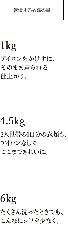 ●風アイロンは、衣類のシワを大幅に低減する機能ですが、衣類の量や素材、一緒に乾燥するものの種類によって仕上がりが異なります。 ●アイロンでプレスしたような効果まではありません。 ●シワが完全になくなるわけではありません。 ●生乾きや乾いた衣類の仕上げとして乾燥運転だけをした場合は、シワをとることはできません。 ●乾燥できないものには使えません(詳しくは、こちらをご覧ください)。